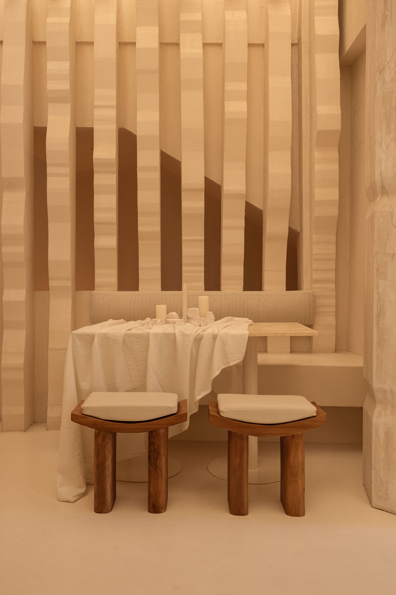 A distinctive element of the design is the cladding columns. These structures, created using 3D printing, present an organic and stratified texture that evokes, on the one hand, the natural beauty and solidity of marble quarries. On the other hand, their shape and arrangement suggest a dramatic reinterpretation of ancient Greece, capturing an atmosphere that is both historical and contemporary.